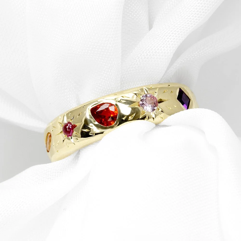 Ideal for straight-edged classic bands, the star setting features a subtle, low-profile design where the stone sits flush with the metal, secured by three tiny beads. Often accented with engraved star or decorative motifs, this setting offers a sleek, secure, and understated sparkle with a charming vintage touch.