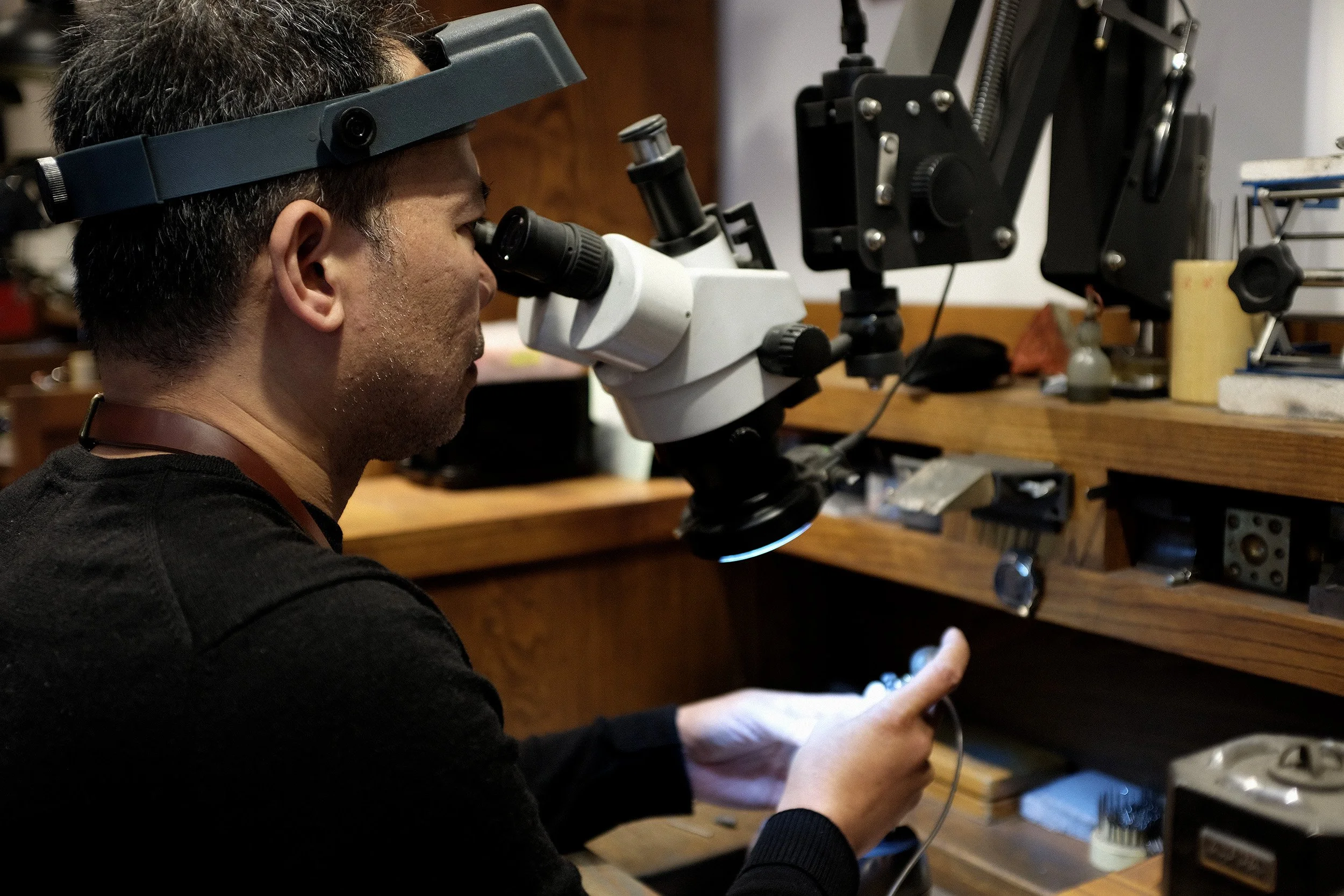 Our goldsmiths work under 50x magnification microscopes, pushing their work into the realm of microengineering. This level of magnification requires immense control and patience but allows for an extraordinary degree of finesse. Under the lens, even the tiniest details are brought into sharp focus, ensuring the structural integrity and refinement of every component before it reaches the hands of a stone setter.